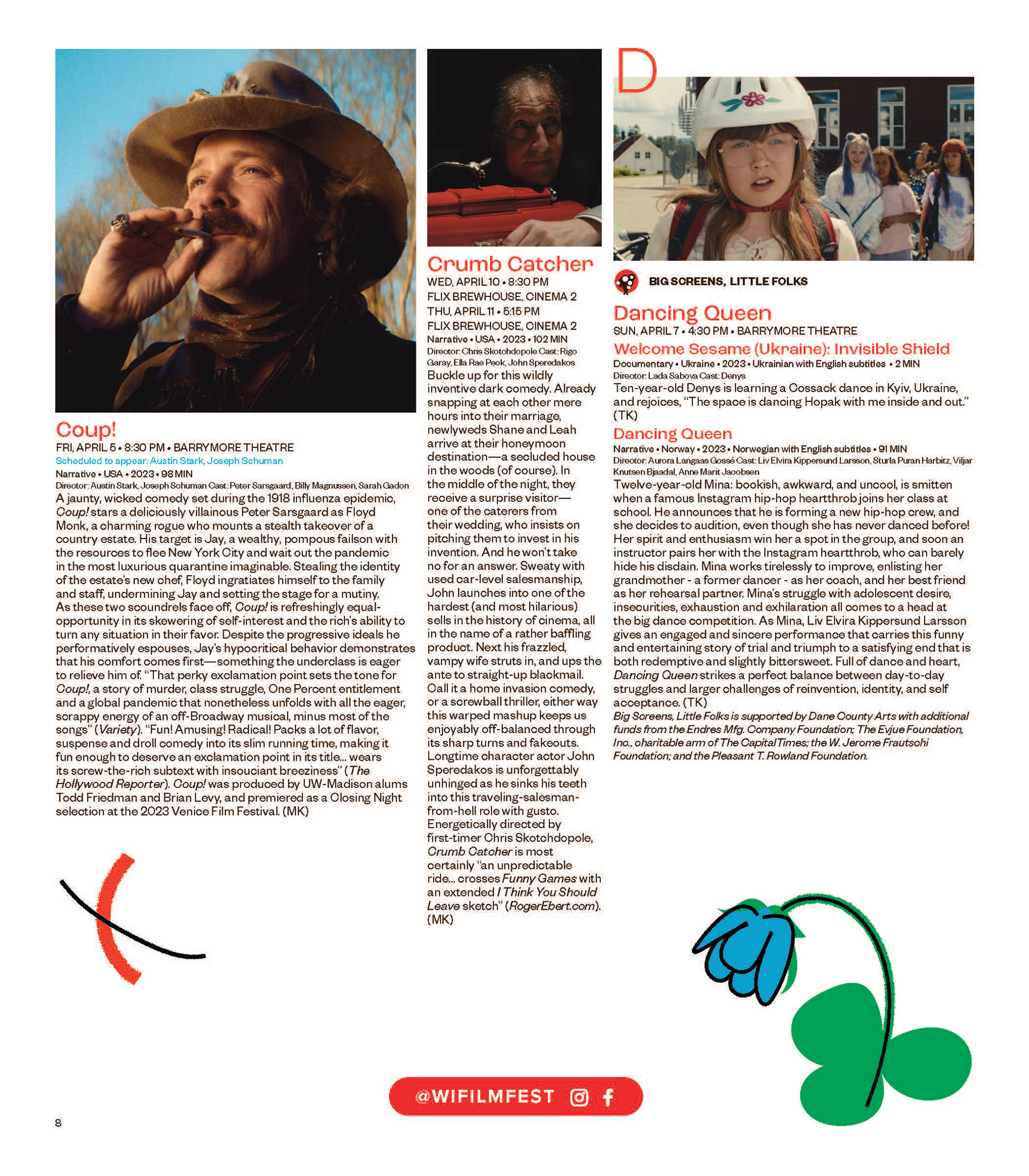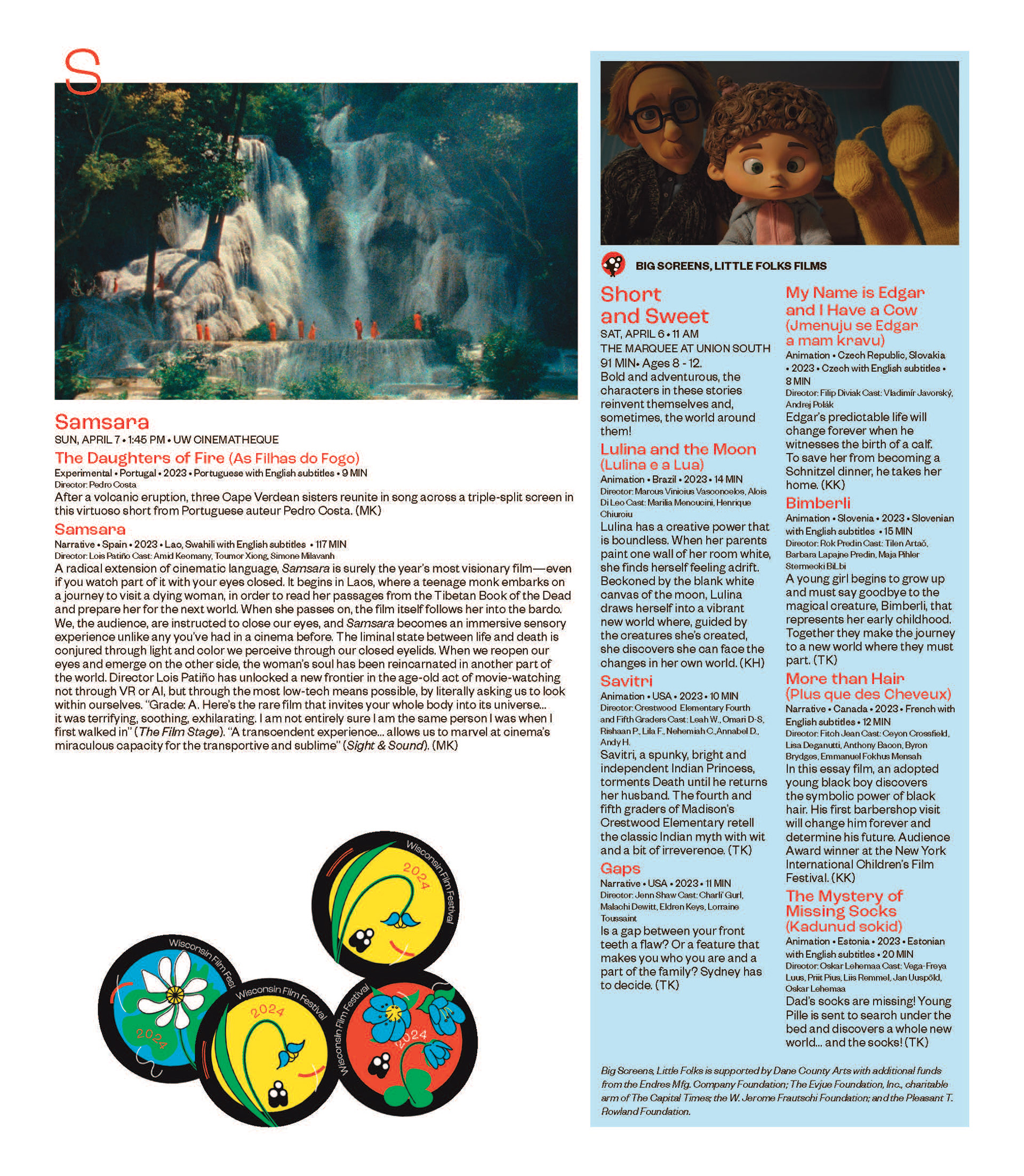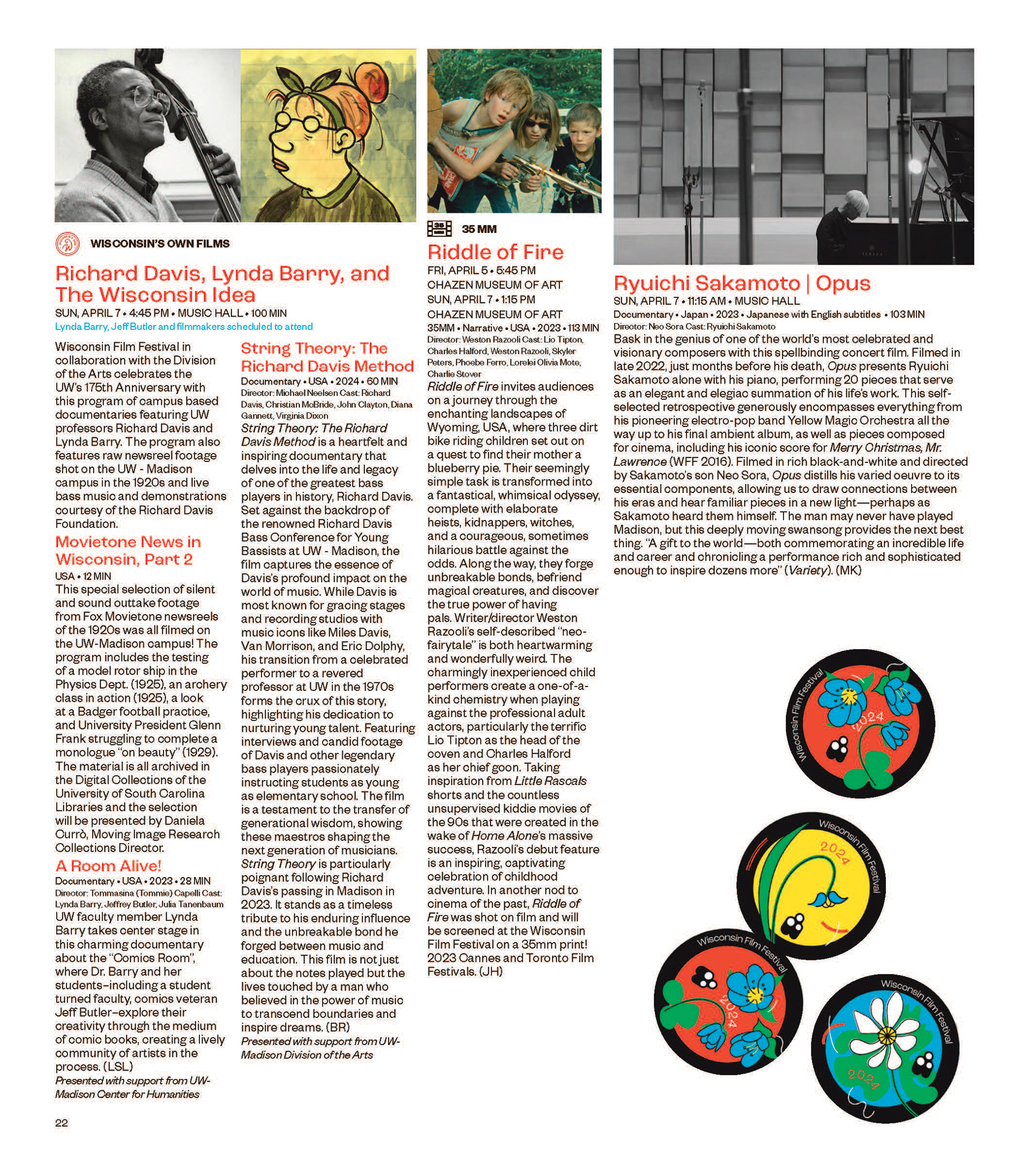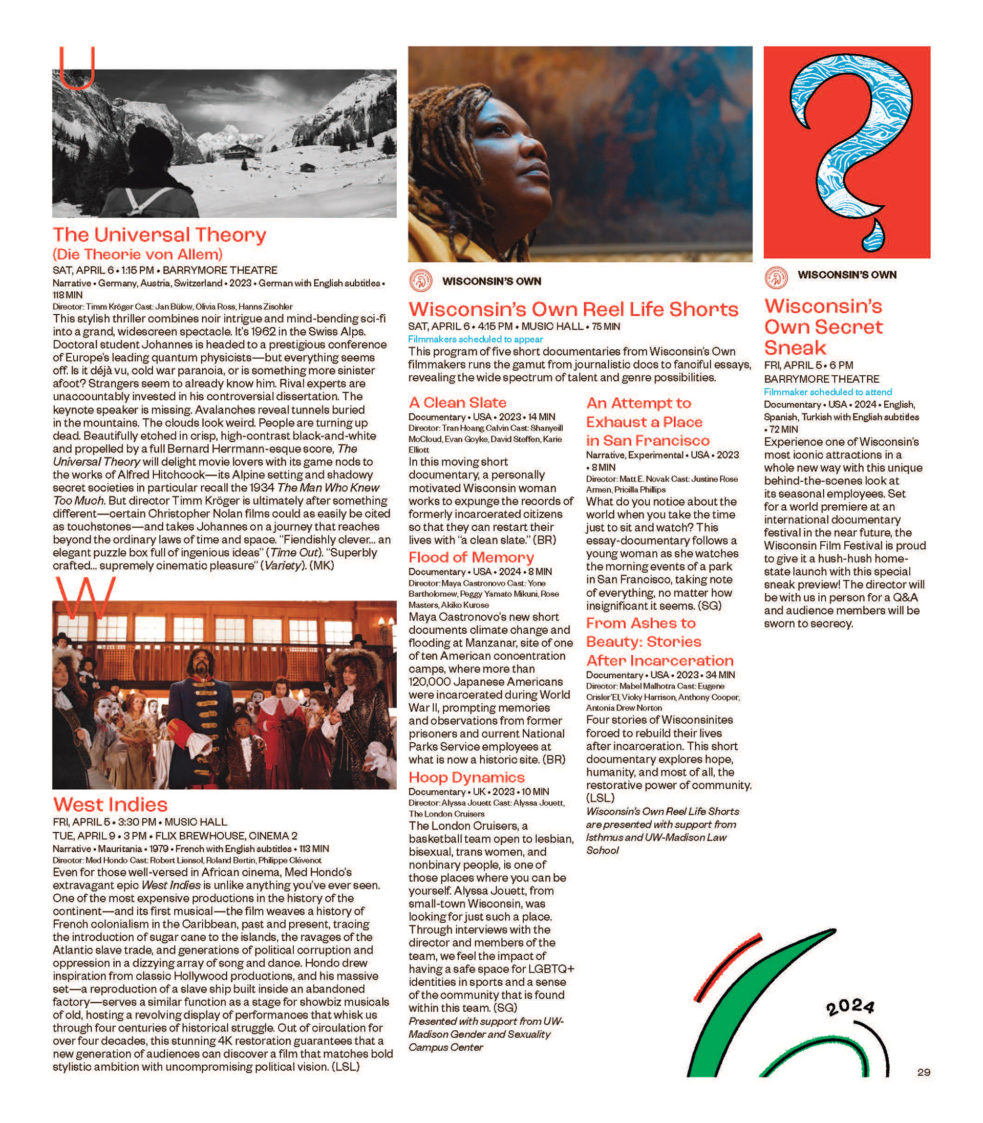 I have been working as a seasonal Junior Graphic and Layout Designer along side Christina King for the annual Wisconsin Film Festival. I started working with them in the spring of 2024, originally only doing layout design for the Film Guide. In 2025, I got to do even more, including promotional materials, flyers, Instagram ads, creating templates to promote businesses, sponsors and movies, and much more! Each year, they come to me with the color palette and theme pretty much set, which means I am required to design unique materials within those perimeters.