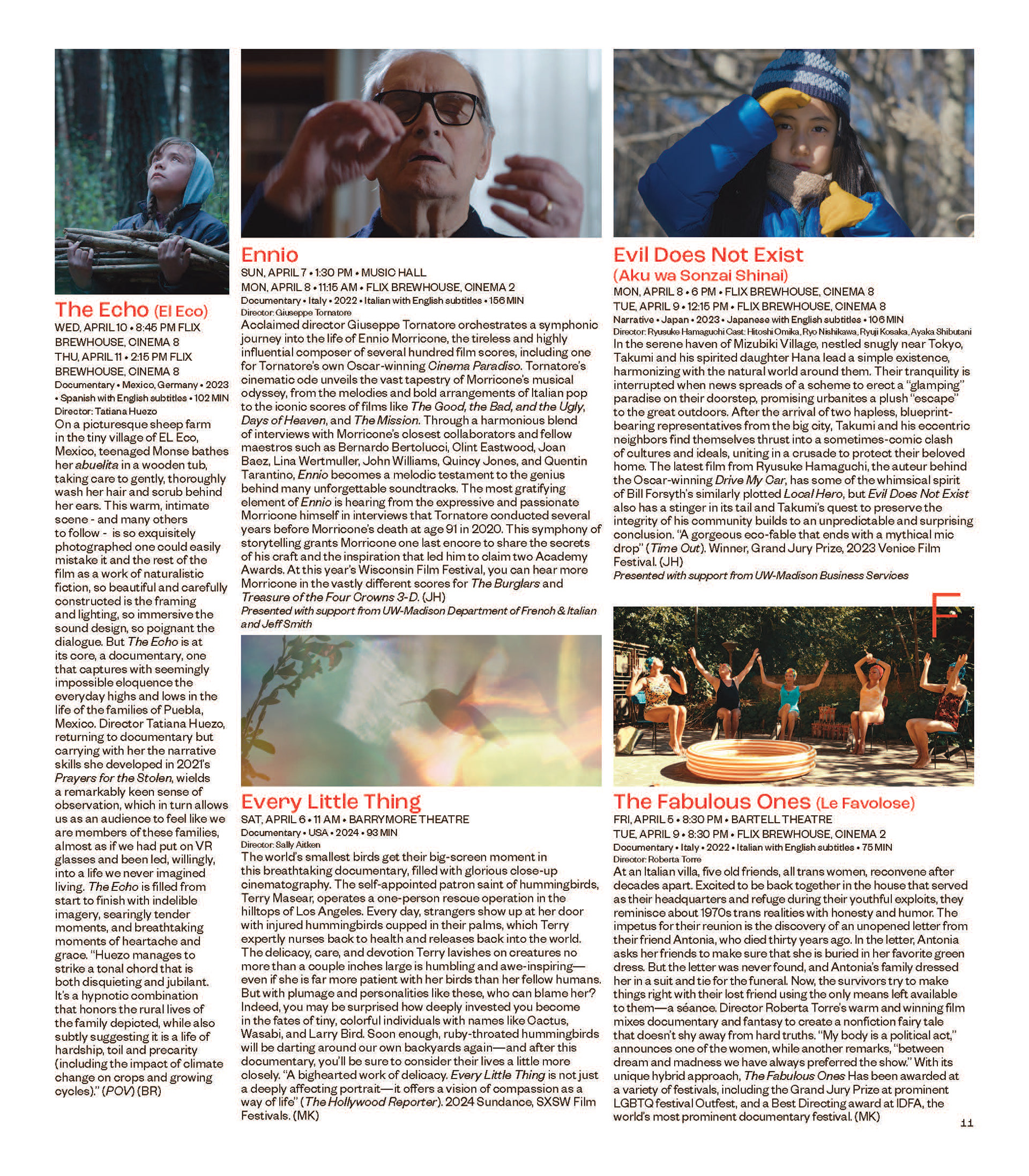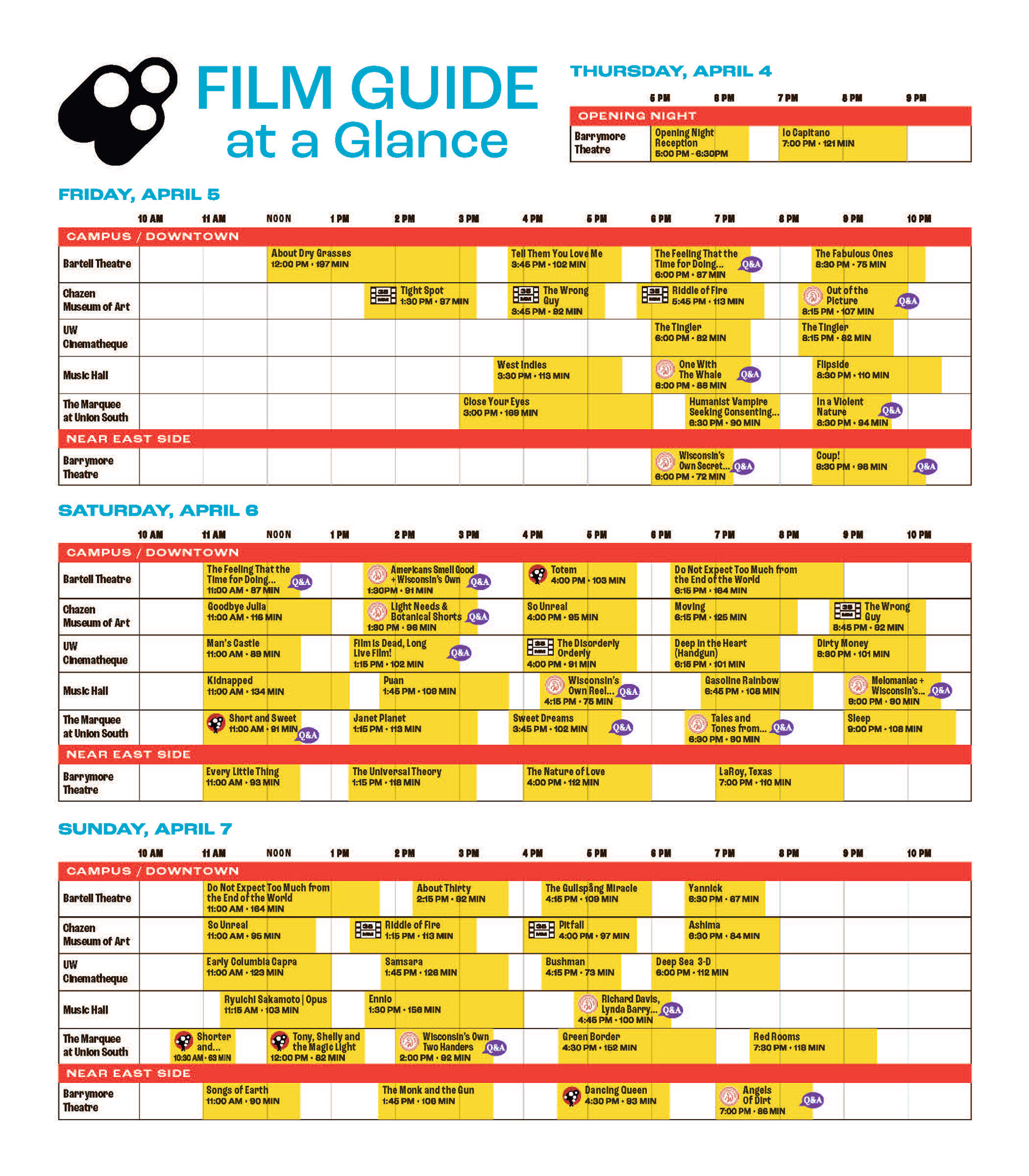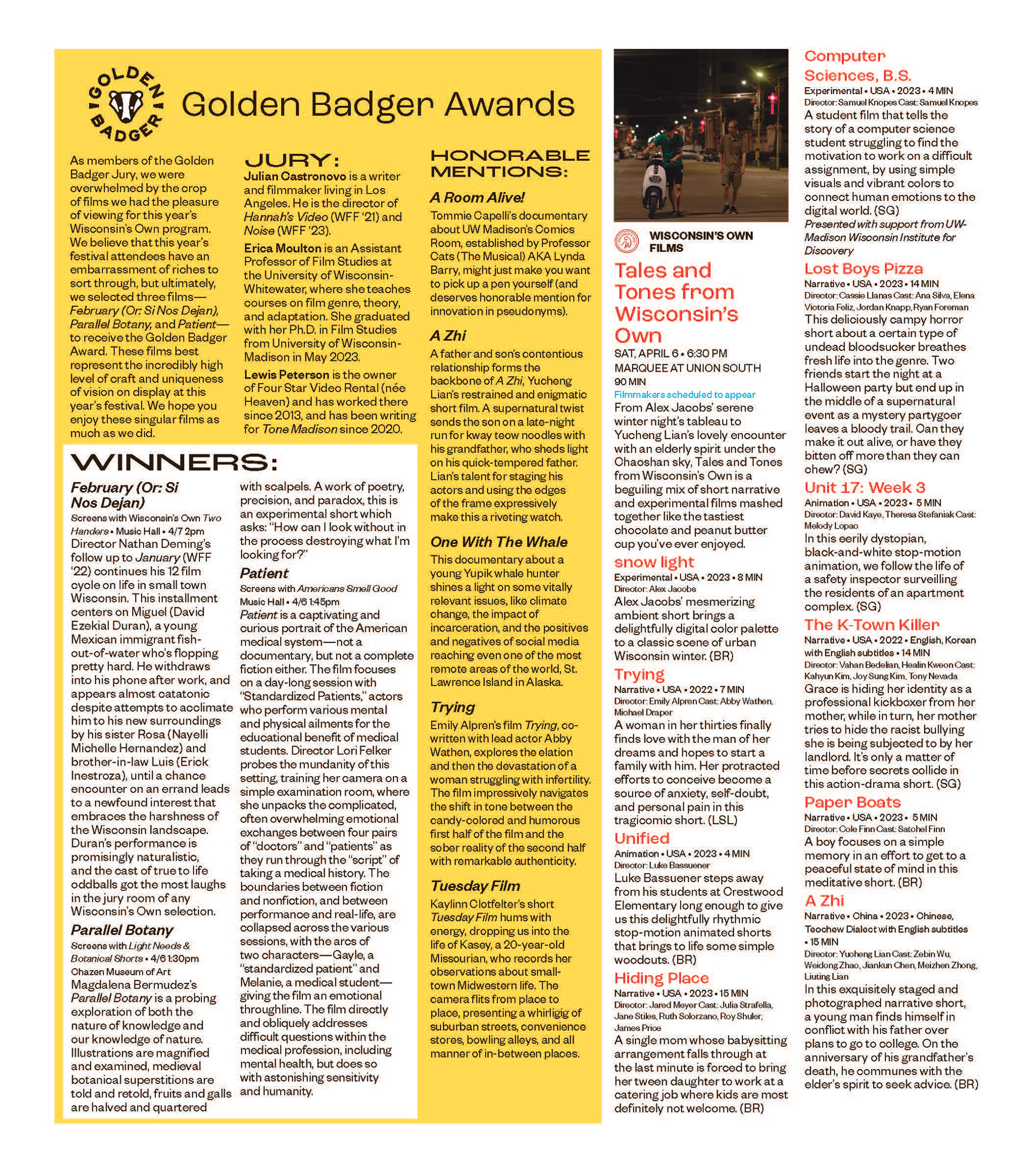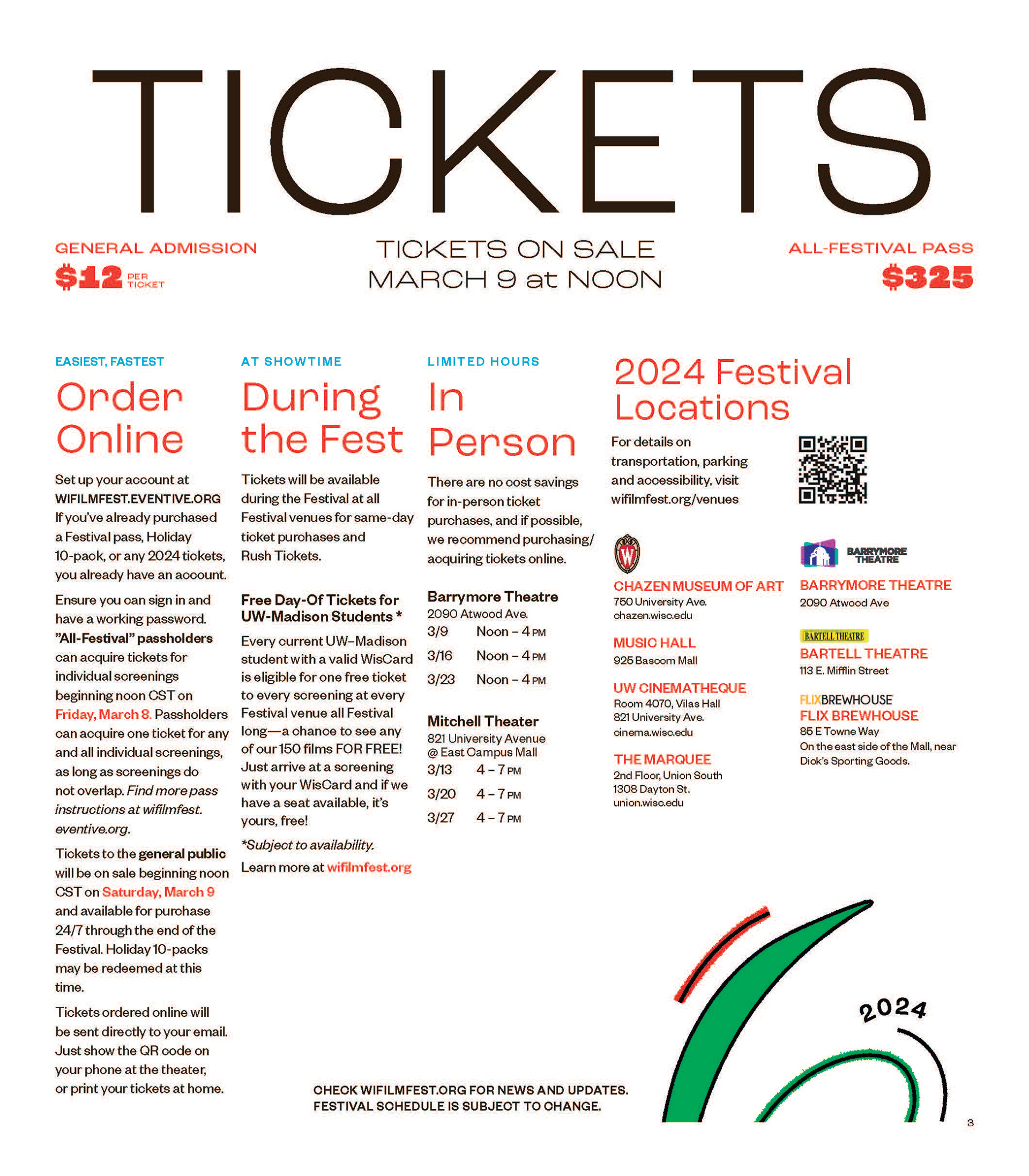 I assisted in the layout design for the Wisconsin Film Festival Guide, which also included the front cover, the index page, the about/info page, and the tickets page.